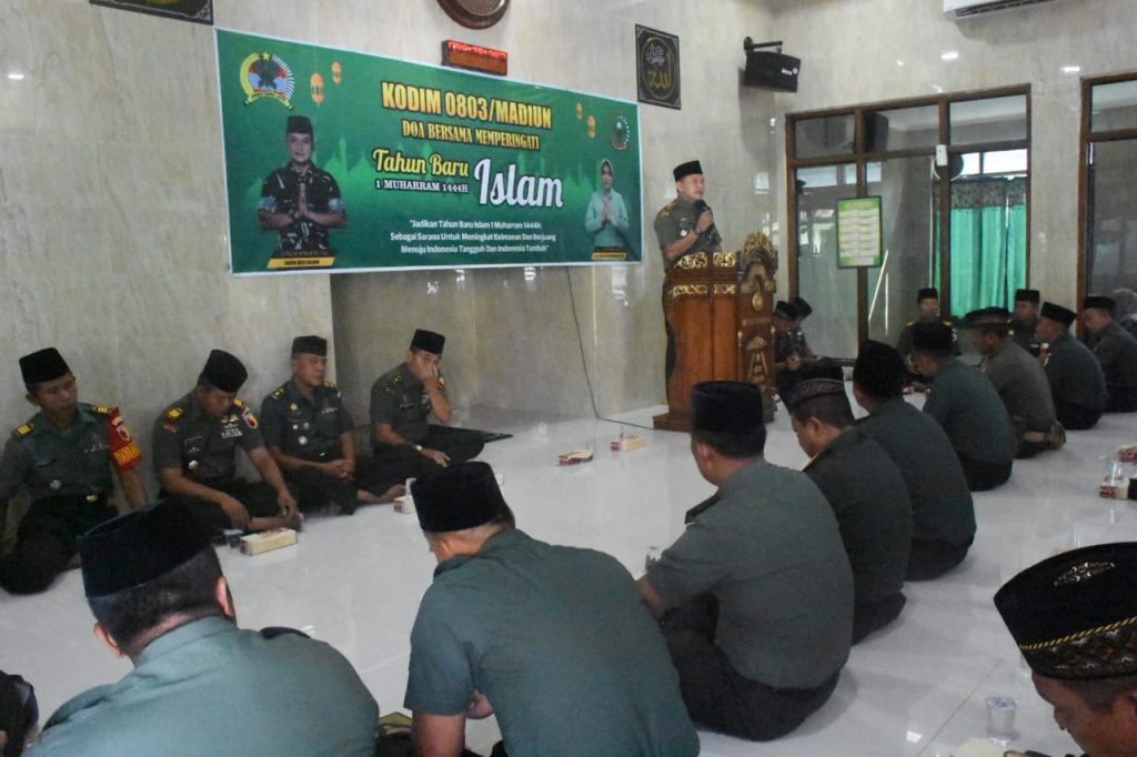 Madiun – Momen tahun baru Islam 1 Muharram 1444 H / 2022 M dijadikan sebagai momentun bagi Kodim 0803/Madiun untuk melaksanakan berdoa bersama di Masjid Al-Mujahidin yang di ikuti seluruh Prajurit dan PNS jajaran Kodim 0803/Madiun, serta Persit Kartika Chandra Kirana Cab XVII Dim 0803. Rabu (3/8/2025).